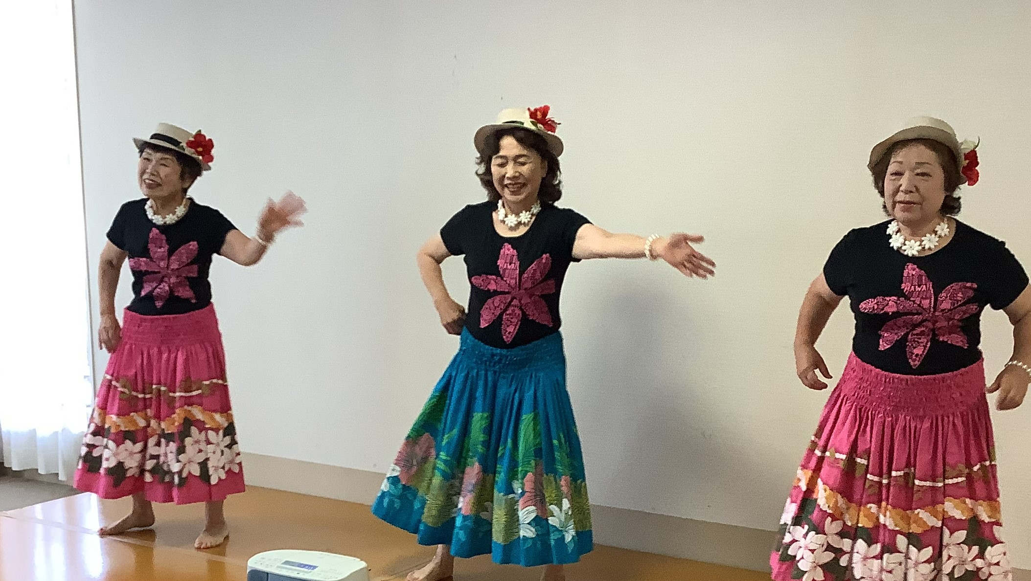 フラダンス 2023 年 7 月 26 日 フラダンスのボランティアさんにお越しいただきました 音楽に誘われ、一緒に踊ります 銀座カンカン娘も踊ってくださって、皆さん口ずさんでいました。 夏にぴったりのイベントでした。 お披露目ボランティアも募集中です。
