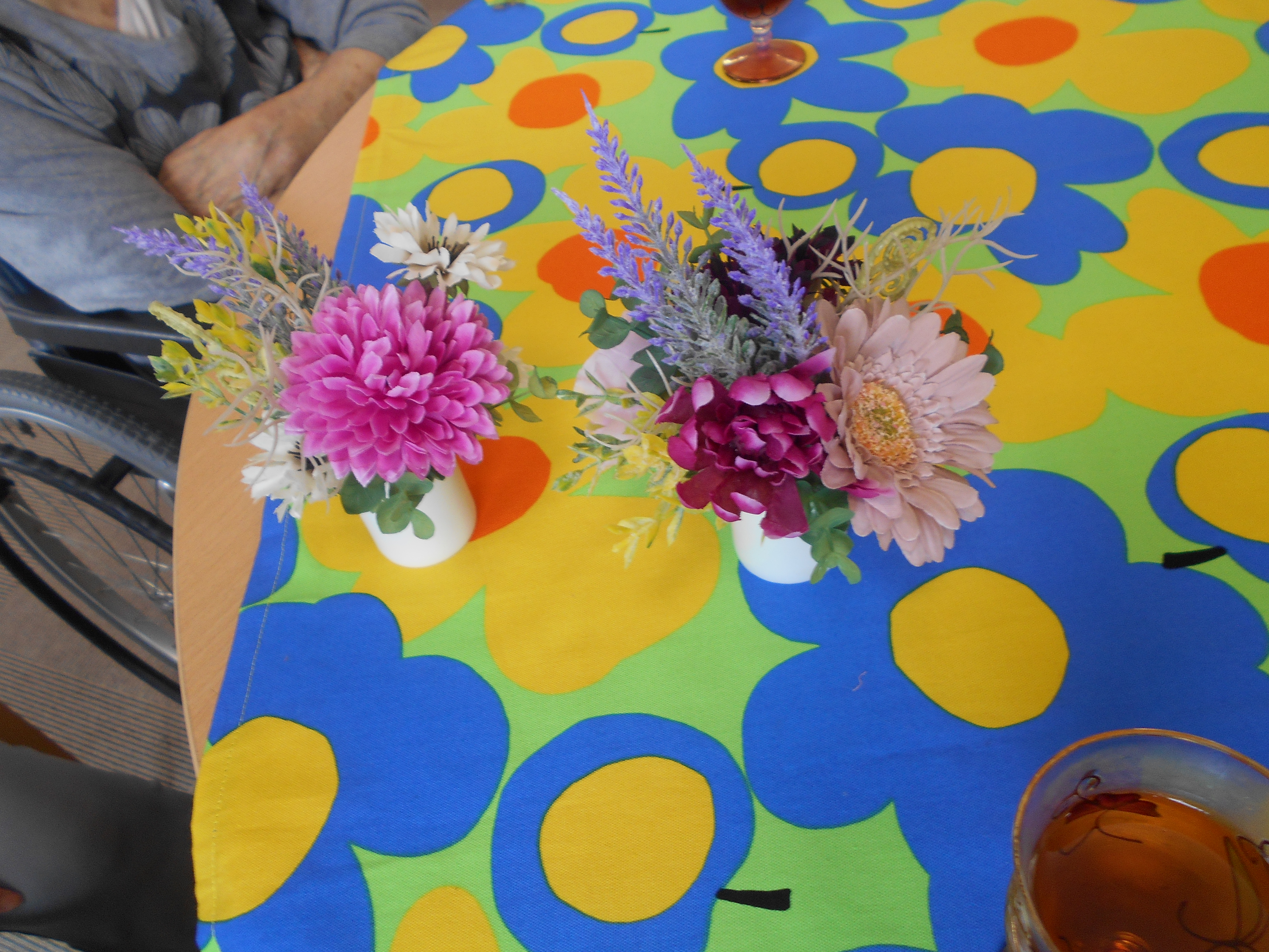 テーブルにもフラワーアレンジメント🌷と鮮やかなテーブルクロス、