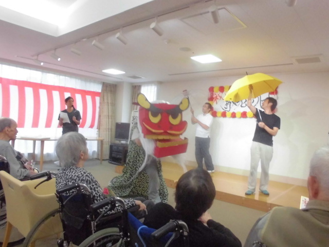 手作りの獅子で『おめでとぉございますッ』
