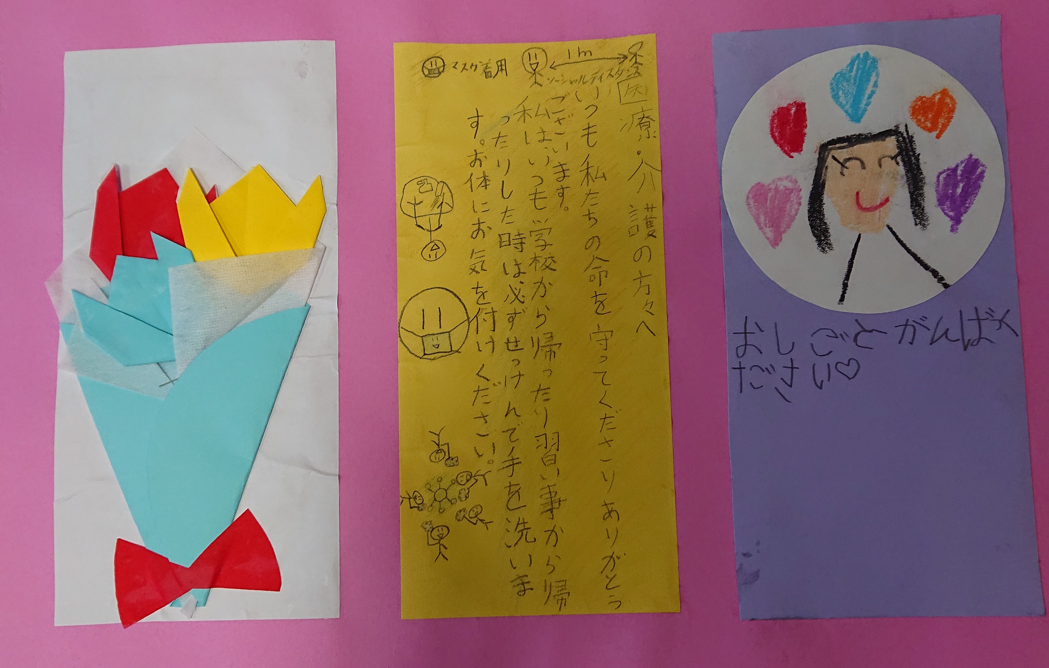 古千谷小学校・舎人幼稚園・つばめ幼稚園の皆様 ありがとう【古千谷苑】 2021 年 2 月 16 日 古千谷小学校 舎人幼稚園 つばめ幼稚園の皆さんから応援のメッセージが届きました。嬉しくて、泣きそうですよ。ご紹介しただけでなく、本当にたくさん届けていただきました。 みなさんも色々な我慢もしたり、行事もなくなることもありさびしい思いもされているのだろう思います。皆さんもとって頑張っていると思います。 思いやりの心のある皆さんの明るいいつもどおりの生活が戻るよう、私たちも頑張りますよ! 今まで以上に頑張りますよ! 頑張れそうです!