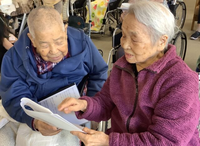 歌詞カードで確認しながら、懐かしの歌を歌います