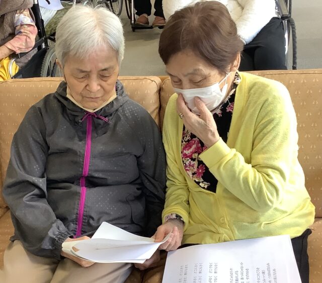 歌詞カードで確認しながら、懐かしの歌を歌います